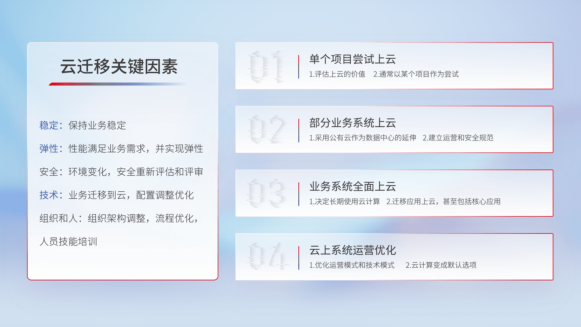 结合实际业务,,,,从规划设计、、云平台选型、、云原生改造、、数据迁移、、、、集成交付,,迁移全过程为客户识别最佳上云路径,,做好风险识别管理,,,设计网络架构、、、、身份权限、、安全审计合规、、、、操作审计、、、日志审计、、、监控告警策略、、、多站点容灾设计等,,,,对云上基础设施进行整体规划,,,,提升IT治理水平,,以满足弹性、、、、高可用、、、高性能的需求。。