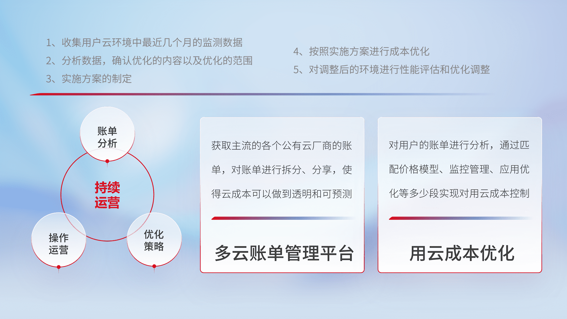 通过多云纳管,,以统一的资源数据模型把客户的云资源进行抽象和封装,,,进而实现对多云资源的统一操作,,,保障云资源管理的可靠性、、、稳定性与可用性。。。。量身定制化运维内容,,,,配置、、、、开发运维、、、、补丁管理、、、备份、、、、监控、、、、认证和访问管理、、、、审计和日常巡检等,,保障在用云过程中的可靠度,,稳定度以及高可用率。。